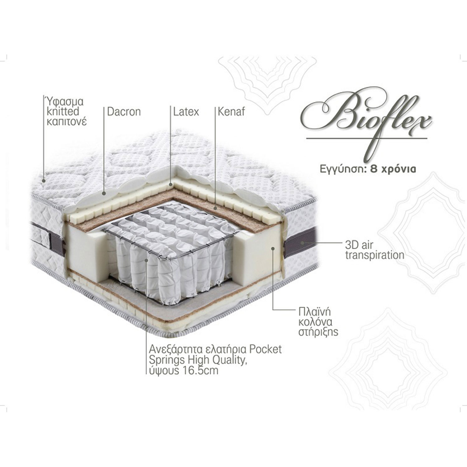 Με τις ξεχωριστές ιδιότητες του φυσικού υλικού Latex και του οικολογικού υλικού Kenaf, σε συνδυασμό με τα ανεξάρτητα ελατήρια Pocket Springs High Quality και το σύστημα αναπνοής στρώματος 3D Air Transpiration, απολαύστε ένα υπέροχο στρώμα που σας προσφέρει ποιοτικό και υγιεινό ύπνο. Η επιλογή είναι δική σας.